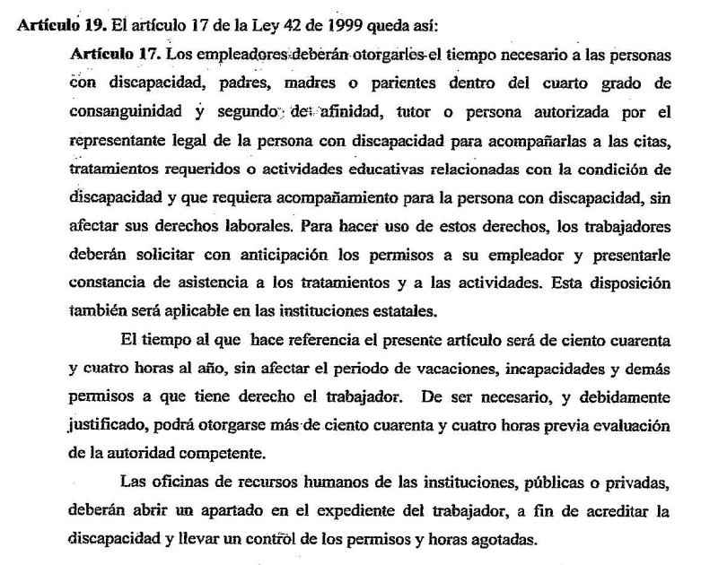 En Panamá, los padres, madres o tutores legales de niños con discapacidad cuentan con un respaldo legal que les permite acompañar a sus hijos a terapias, consultas médicas y actividades educativas sin que esto afecte su estabilidad laboral. Este derecho está protegido por la Ley 15 del 31 de mayo de 2016, que reforma la Ley 42 de 1999.